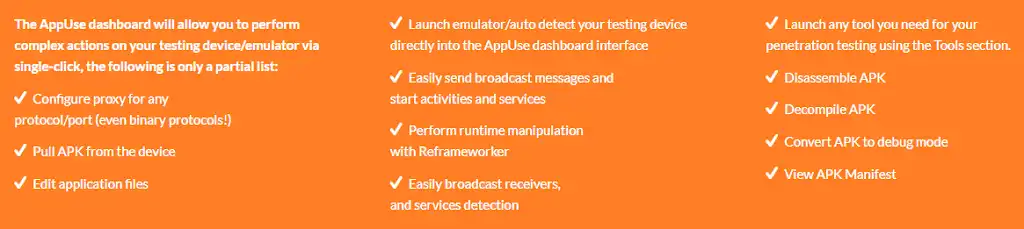 AppUse includes everything the pentester needs in order to run and test target applications: the Android emulator, development tools, the required SDKs, decompilers, disassemblers, etc.