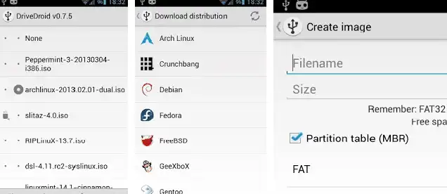 DriveDroid also includes a convenient download menu where you can download USB-images of a number of operating systems from your phone (like Mint, Ubuntu, Fedora, OpenSUSE and Arch Linux). Around 35 different systems are available at this moment.