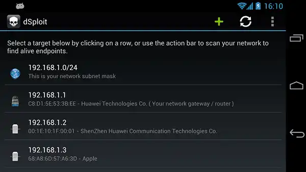 Once the dSploit hacking app is started, you will be able to easily map your network, fingerprint alive hosts operating systems and running services, search for known vulnerabilities, crack login procedures of many TCP protocols, perform man-in-the-middle attacks such as password sniffing ( with common protocols dissection ), real-time traffic manipulation, etc, etc